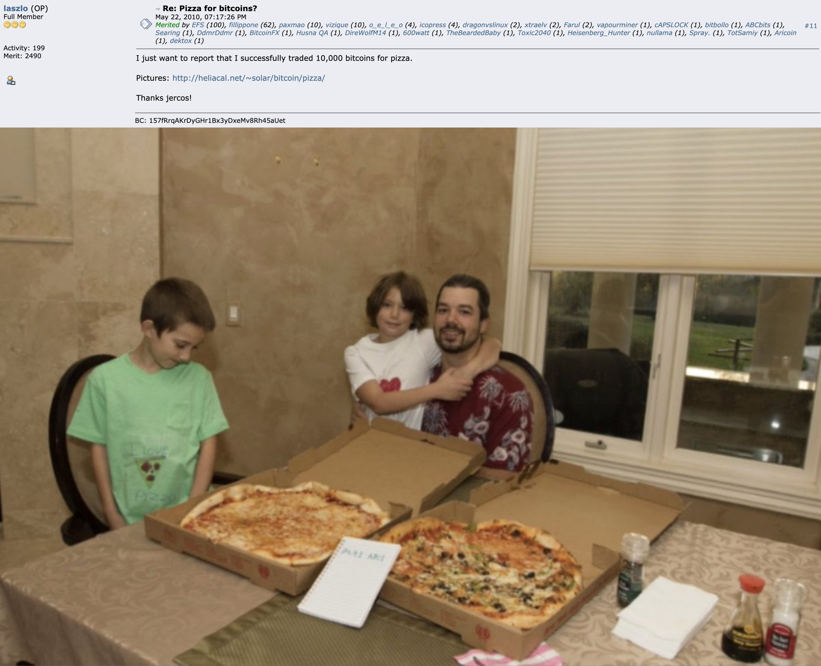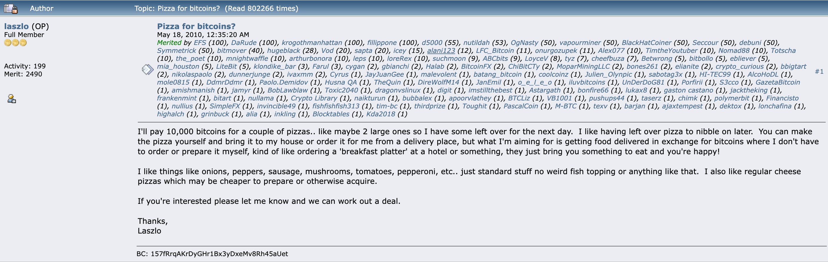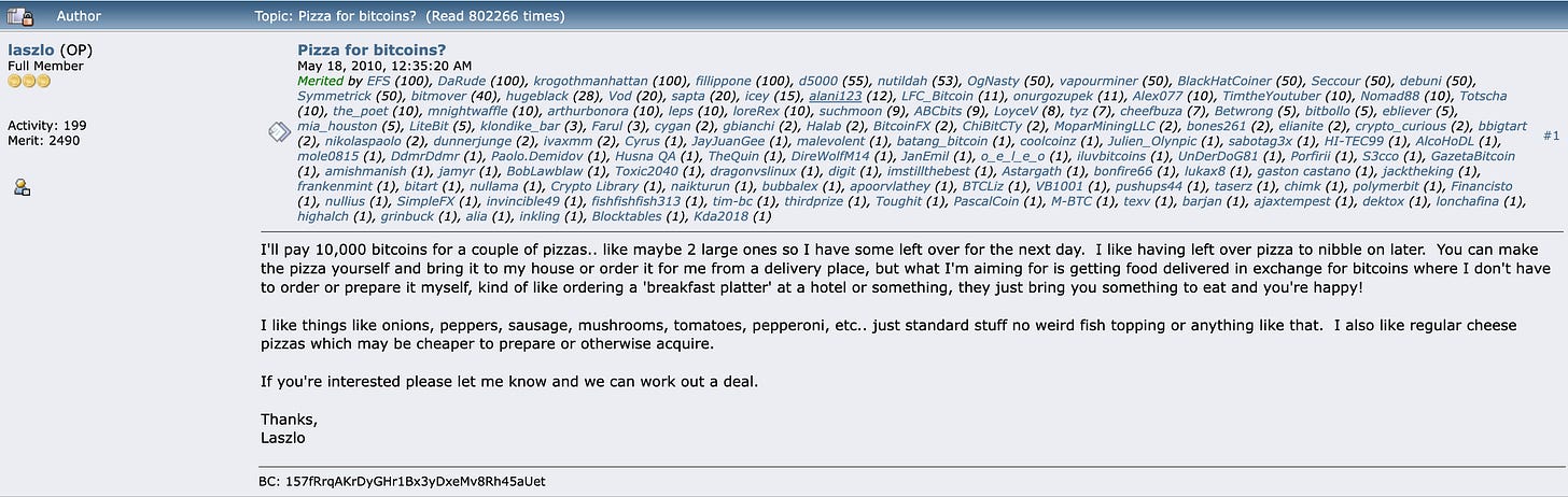 2010 年 5 月 18 日,Laszlo Hanyecz 先在比特幣論壇上發文詢問1,是否有人願意讓他用比特幣換披薩。