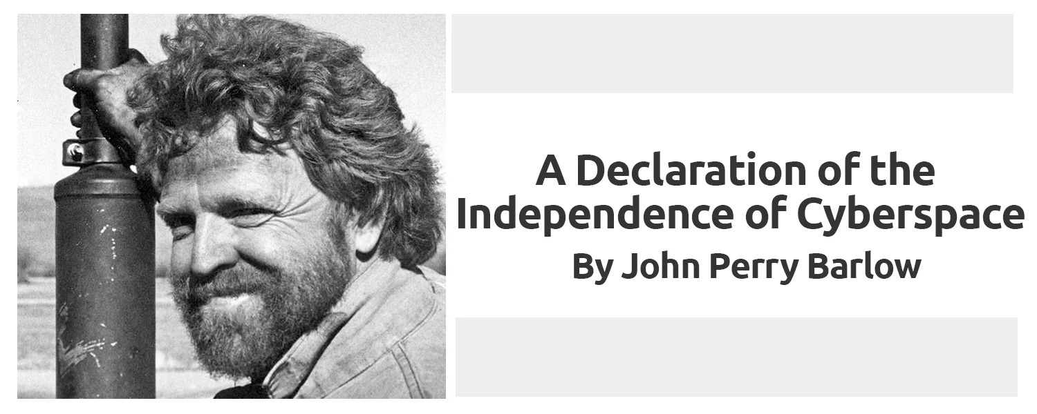 我們先把時間拉回到 1996 年,約翰・佩里・巴洛(John Perry Barlow)發表《網路空間獨立宣言》3,主張網路空間不受政府與主權國家控制,強調資訊自由、個人主權與去中心化的社群治理。